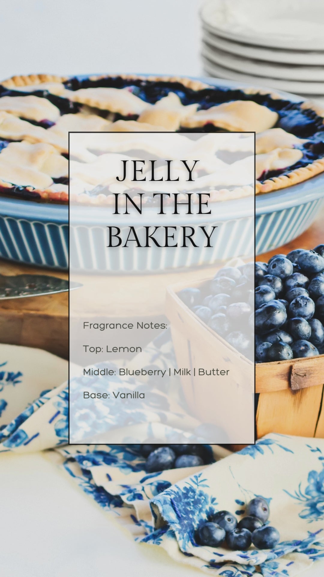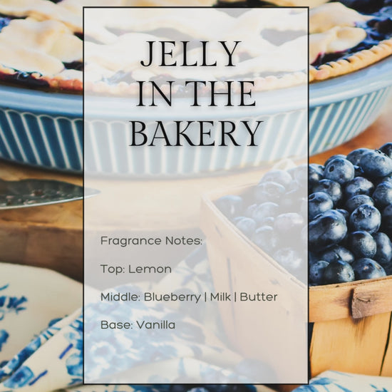 Journey with JELLY IN THE BAKERY. Indulge in the warm, buttery aroma of fresh baked lemon blueberry pie. The zesty lemon and tangy blueberry flavors blend harmoniously into a mouth-watering finish. Enjoy the scent of fresh baked pie without the oven!